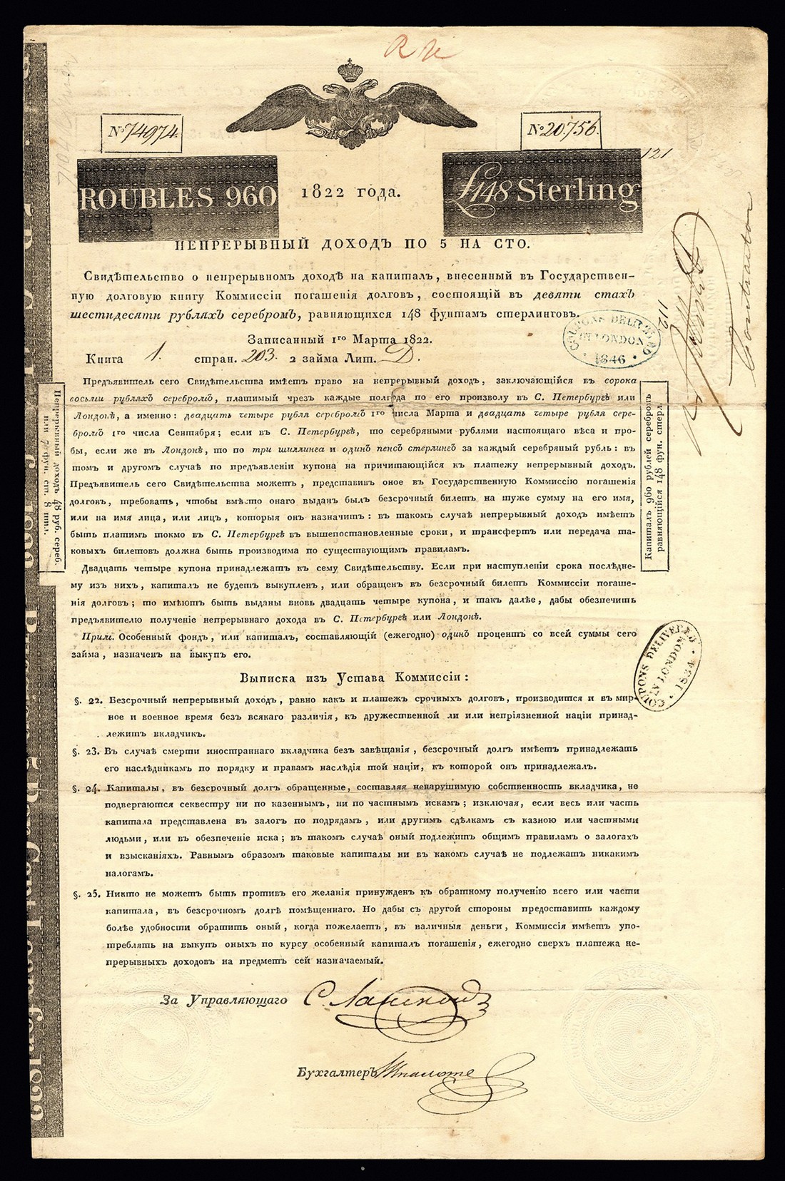 1822 5% 'Rothschild' Loan, bond for 960 roubles or £148, handsigned by Nathan Meyer Rothschild, double headed eagle at top, black, on poor quality paper, with talon, folds but without repairs, AVF.