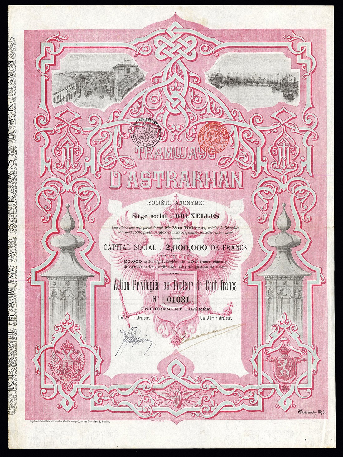 Tramways D'Astrakhan S.A., two pieces, one ordinary share without par value, together with one preference share for 100 francs, not dated but both circa 1896, ornate scrollwork, vignettes at top of trams in street, and river bridge, coats of arms at bottom corners, underprint vignette of Russian coat of arms, blue & orange, and red respectively, the first with coupons, both VF. (2)