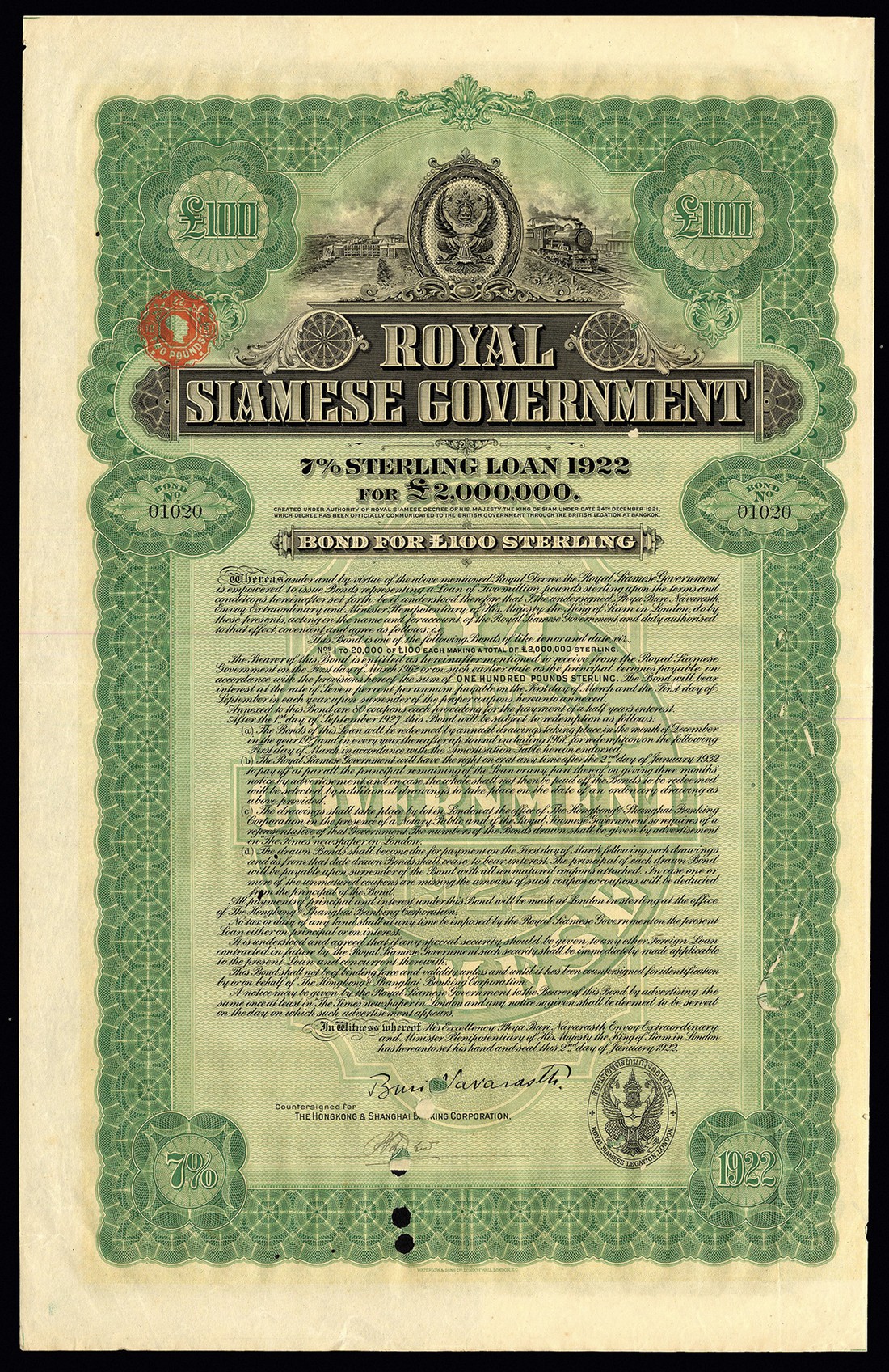 Royal Siamese Government, 7% Sterling Loan 1922, bond for £100, #01020, large format piece with coat of arms at top flanked by steam train and canal scene, green and black, printed by Waterlow & Sons, punch cancelled, with coupons, GVF.
