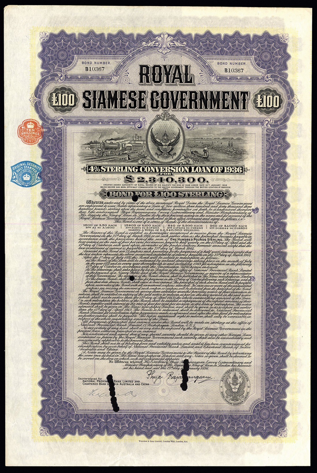 Royal Siamese Government, 4% Sterling Conversion Loan 1936, bond for £100, #B10367, large format with coat of arms in centre, steam train at left, workers in field at right, purple and black, printed by Waterlow & Sons, with coupons, punch cancelled, VF.