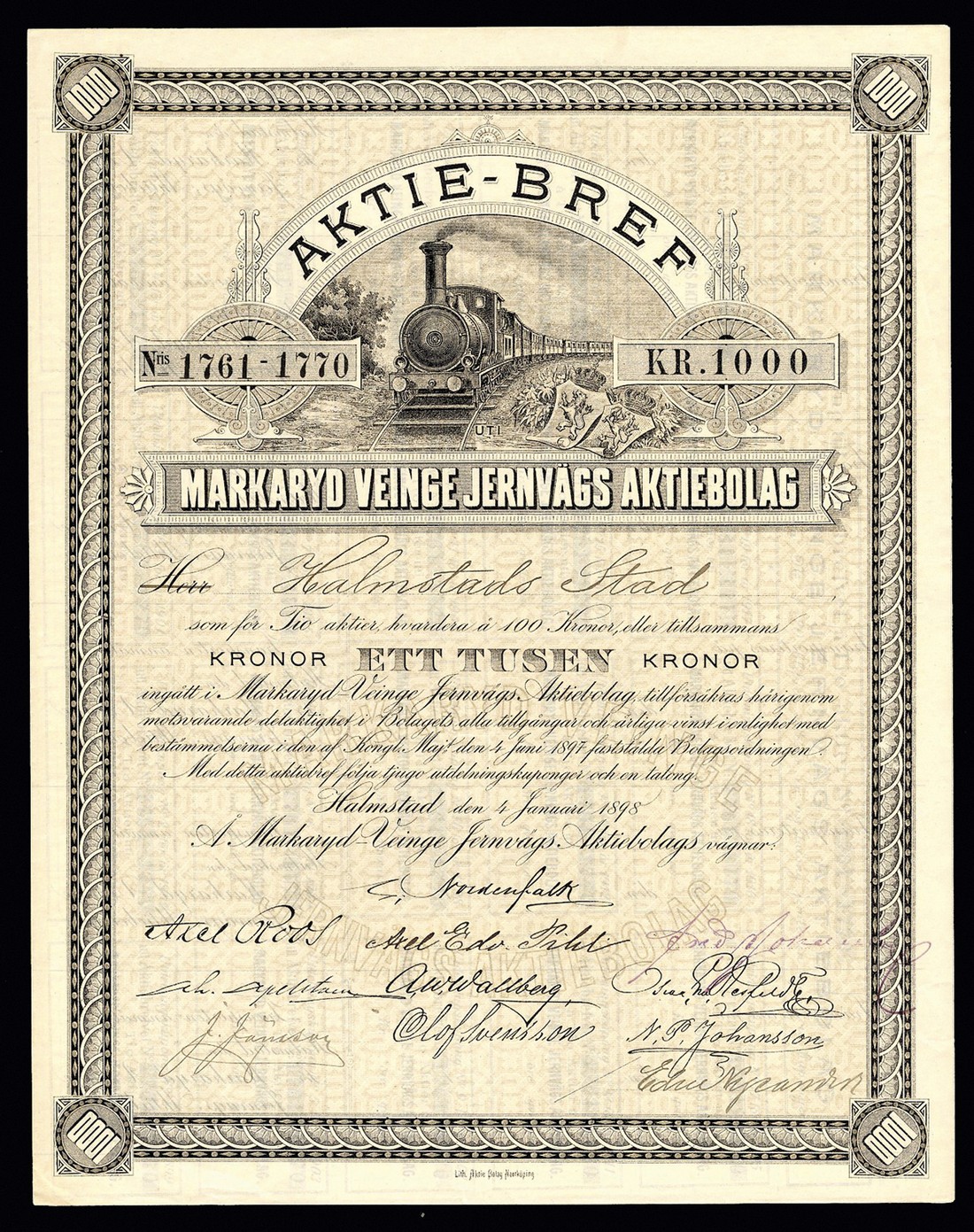 Markaryd Veinge Jernvägs Aktiebolag, ten shares of 100 kronor each, Halmstad 1898, no.1761-1770, steam train at top, ornate border, black and grey, together with Aktiebolaget Nordeuropeiska Handelskompaniet, 500 kronor share, Stockholm 1917, no.7410, vignette of globe with steam ship and train at top, black and turquoise print on buff paper, both with coupons, both EF. (2)