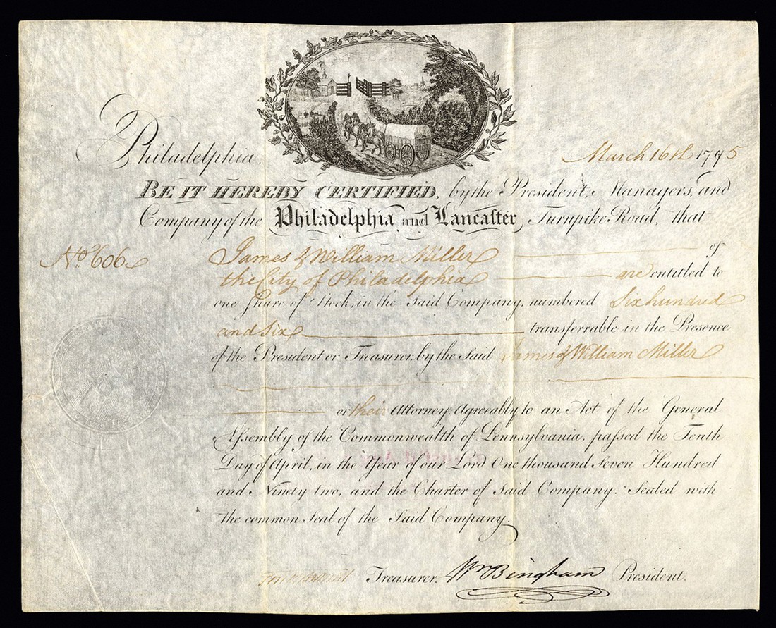Philadelphia and Lancaster Turnpike Road, one share, Philadelphia 179[5], #606, signed by William Bingham as President, wagon and horses approach toll house and gates, black printing on vellum, embossed seal, VF.
