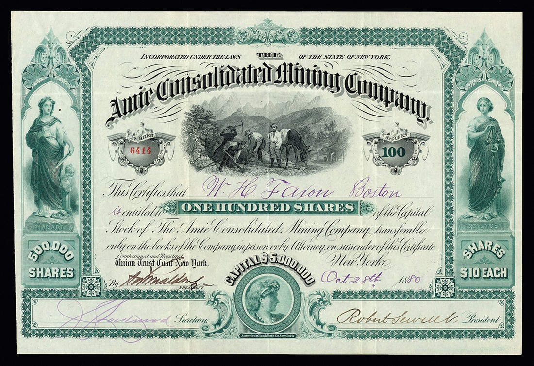 Amie Consolidated Mining Co. (NY), 100 shares of $10, 18[80], #6414, attractive piece with miners in centre, allegorica females at sides, green and black, VF+.