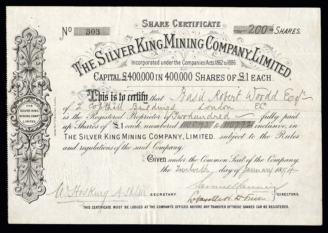 A small collection of British Companies mining in the American west (11), comprising Silver King Mining Co. Ltd., 18[94]; Big Blow Gold Mines Ltd., 189[5]; New Gold Hill Co. Ltd., 18[90]; Mineral Hill New Co. Ltd., 187[8]; Eberhardt Co. Ltd., 18[81]; Anglo-Californian Gold Mining Co., 185[2], 2 examples; "Yankee Girl" Silver Mines Ltd., 189[2]; Le Nouveau Monde, 1851; Camp Bird Ltd., [1926], and Anglo-Argentine Co. Ltd., 1868, generally VF. (11)