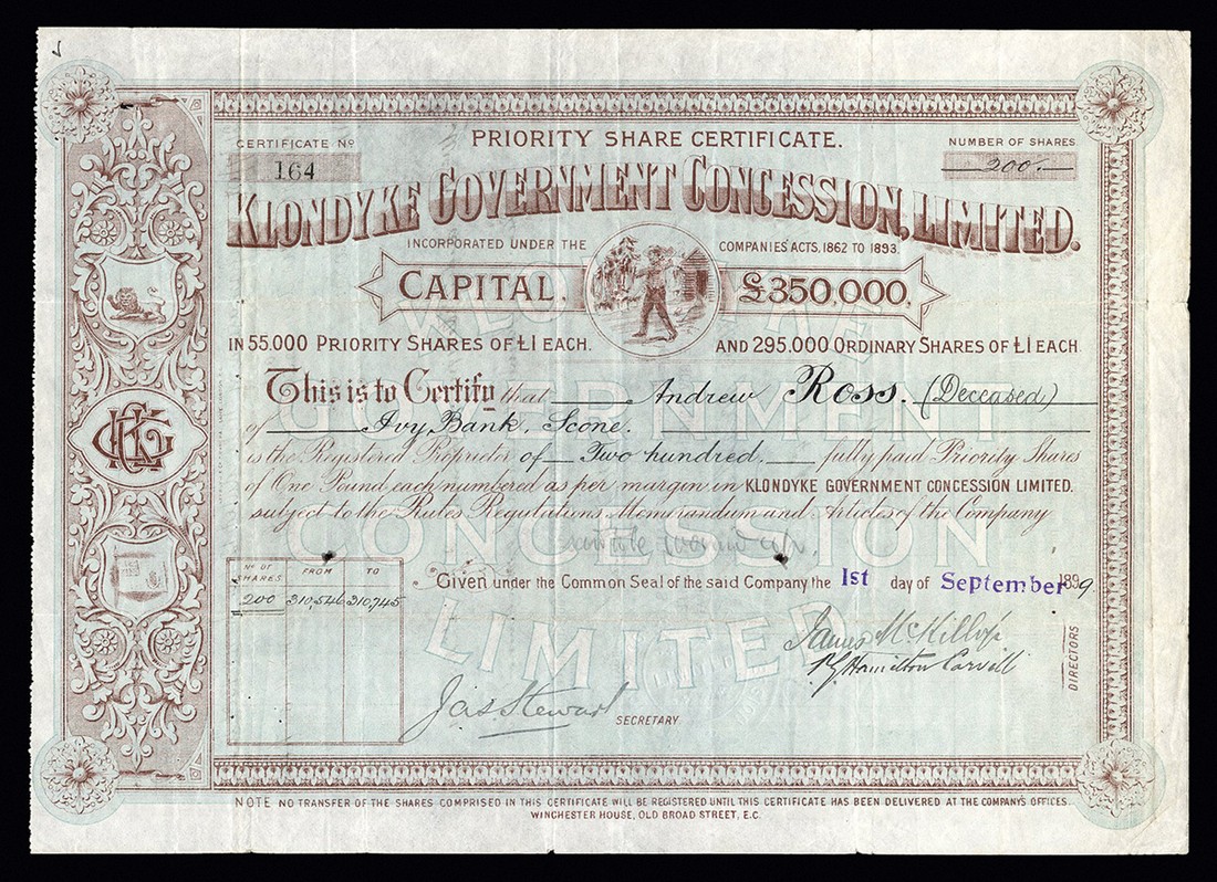 Canada: A small collection of mostly mining certificates (9), comprising Klondyke Government Concession Ltd., £1 shares, 189[9], #164, small vignette of miner, brown, pale blue underprint; King Edward Silver Mines, 100 shares, 19[08], King Edward VII standing in ceremonial robes, orange and black; Blaine Mining & Exploration Co. Ltd., $1 shares, 1[899]; Wild Horse Dredging Co., 19[20]; Porcupine Northern Mining Co., 19[11]; Twentieth Century Mining Co. Ltd., 19[01]; Canadian exploration Co. Ltd., 19[11], and others (2), mixed condition but many VF and better. (9)