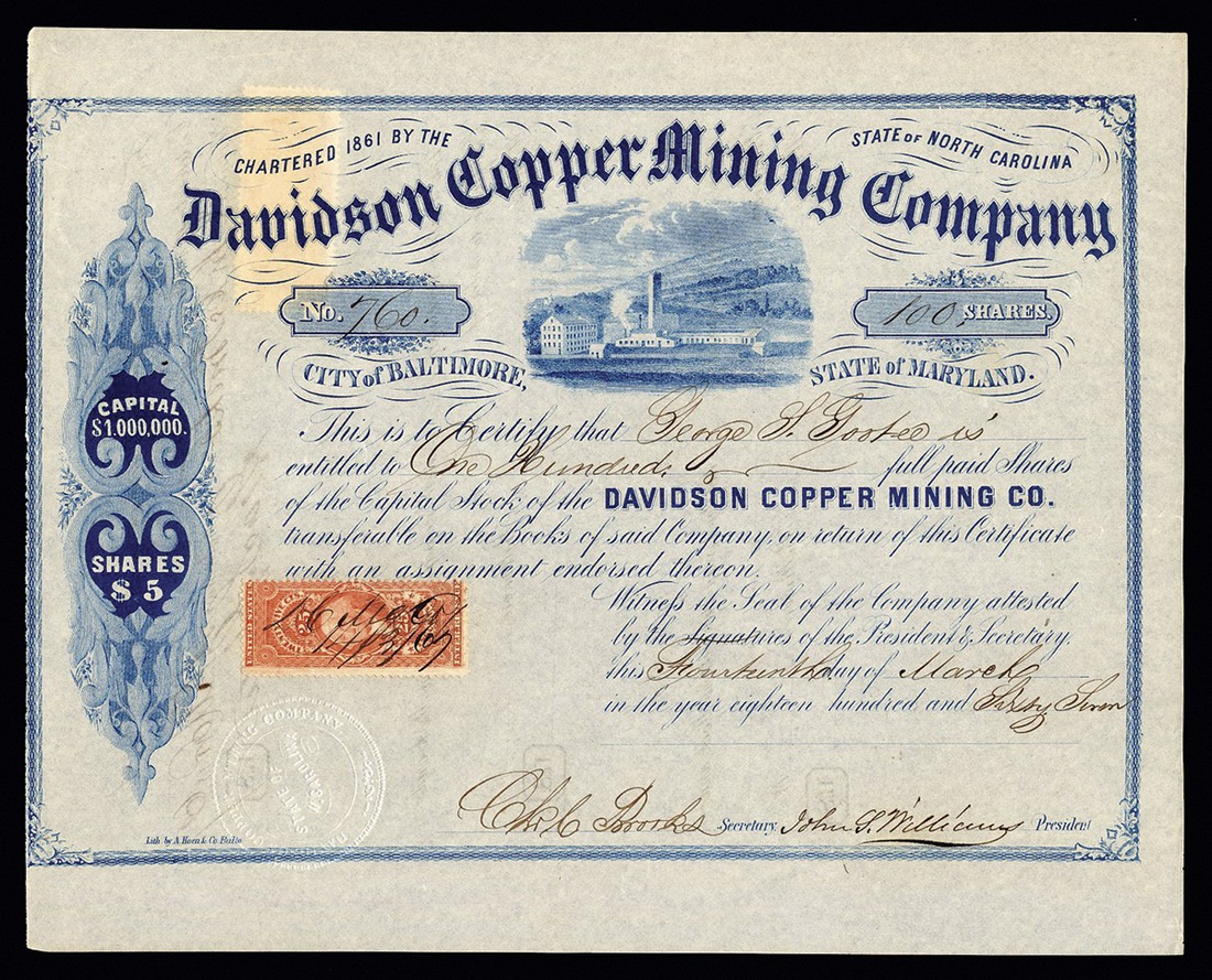 Davidson Copper Mining Co. (NC), $5 shares, 18[67], #760, smelter and works in centre, blue, adhesive revenue stamp, AEF.