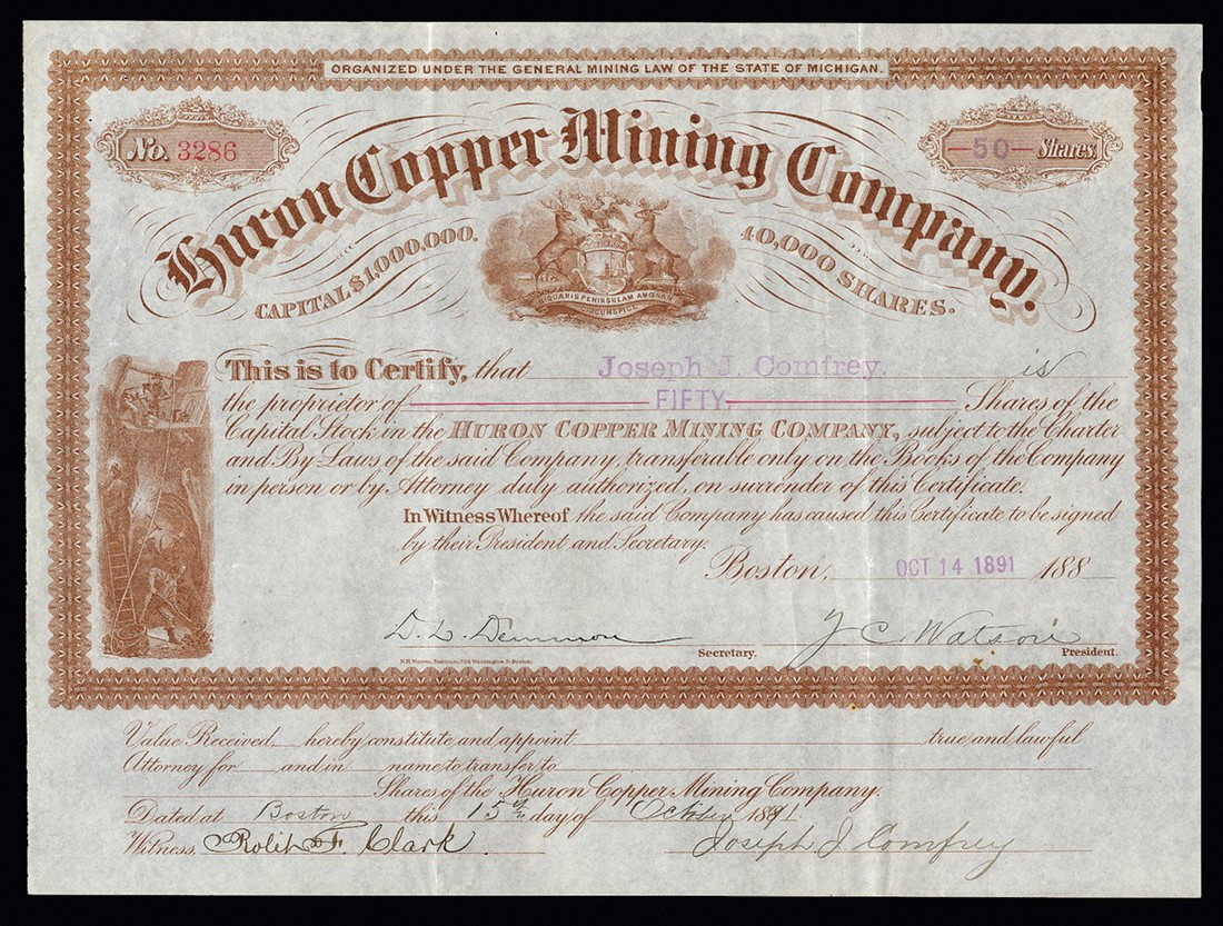 Michigan Mines: Huron Copper Mining Co., $25 shares, 188[91], #3286, mining scene at left, arms top centre, brown, together with Wheat Mining Co., $25 shares, 18[84], #69, arms with miners left and paddle steamer right; and Quincy Mining Co. of Michigan, $25 shares, 185[1],railway scene, black on blue paper and the more common $10 shares, 18[58], arms at top, black, ink cancelled, GVF, VF and F-VF. (4)