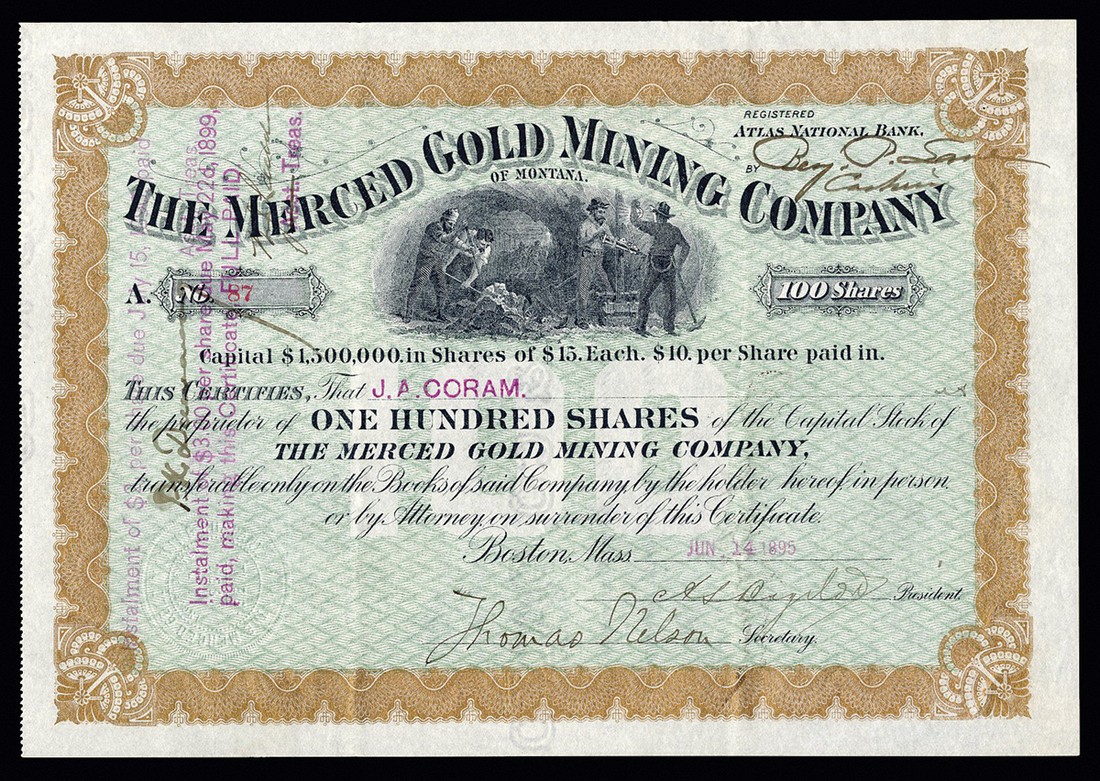 Montana and Idaho mining companies (4), Merced Gold Mining Co. of Montana, 100 shares, [1895], #87, miners in center, gold and black with green underprint; G.V.B. Mining Co., Idaho, $100 shares, 189[7], miners at top left, black; Alta-Idaho Gold and Copper Mining Co., $1 shares, 190[2], mining vignettes, green and black, Goes print, and a cancelled certificate in the Parrot Silver and Copper Company, 19[03], VF and better. (4)