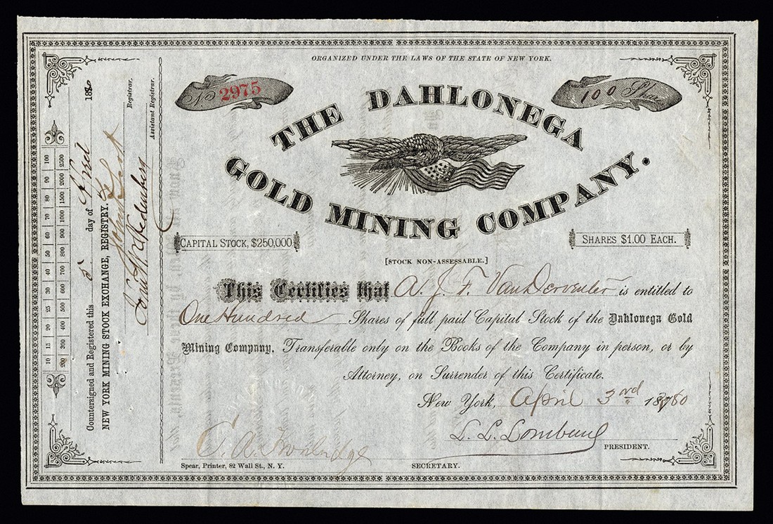 Southern Mines (5), comprising Dahlonega Gold Mining Co. (NY), $1 shares, 187[80], eagle at top, black, mines in Georgia; Granville Gold Co. of New York, $1 shares, 188[1], miners in center, black and red, capital overprinted, mines in North Carolina, ragged right edge; Copper Knob Mining Co., 100 shares of $1, New York 188[1], cherub lower left, black, mines at Gap Creek, Ashe County, NC, and Virginia, Liberty Mining Co., 5 shares of £1, 1852, blue, 2 examples, VF and better unless stated. (5)