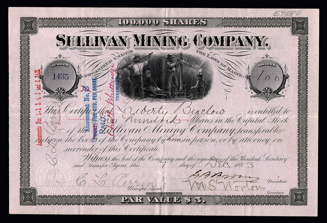 A small group of mining and oil certificates (11), including Sullivan Mining Co. (ME), $5 shares, 188[3], miners at work, black on pink; St.Croix and Lake Superior Mineral Co., one share, 1845, black; Olympic Mining Co. (WA), $1 shares, 190[2], mining camp left, black and yellow; Ross Oil Co., $1 shares, 186[4], oil derricks and storage tanks, cancelled, and others (7), mixed condition, a few cancelled, fine to very fine, a few better. (11)