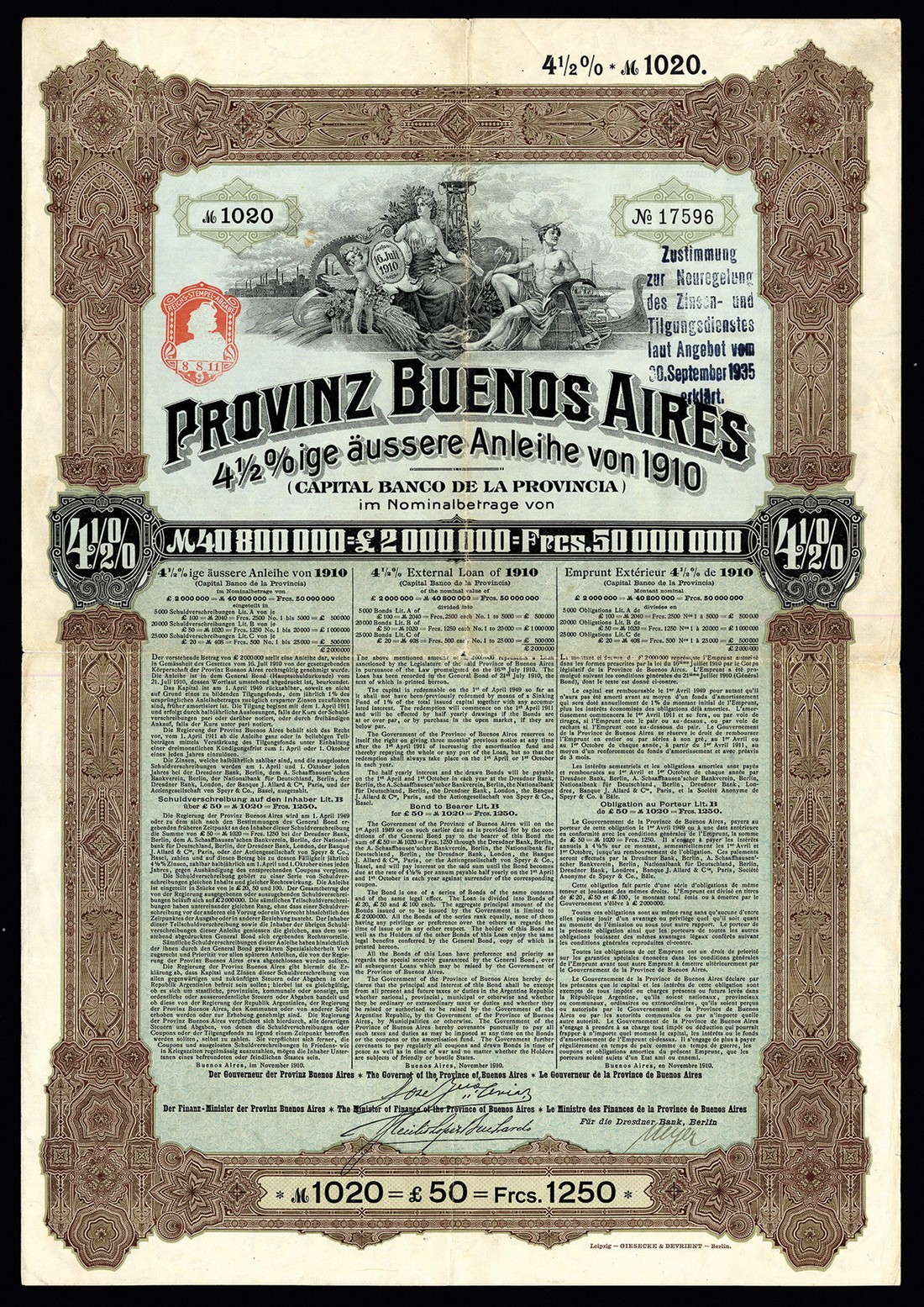 Provinz Buenos Aires, 4 1/2% External Loan 1910, bond for £50, no.17596, attractive piece with vignette of allegorical figures with cherub, torch, and various industrial and nautical artefacts, ornate border, brown and black with pale blue underprint, VF.