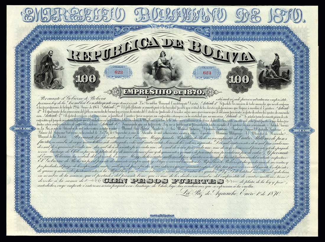 Republica de Bolivia, 8% Loan 1870, a trio of un-issued bonds for 100, 500 and 1000 pesos, allegorical figures at top which vary with denomination, ornate border, blue, orange and green respectively, with coupons, EF. (3)
