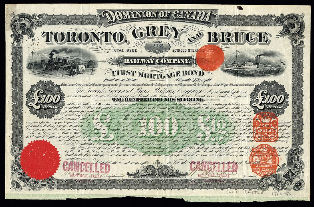 Toronto, Grey and Bruce Railway Company, first mortgage bond for £100, Toronto 1884, no.2035, very attractive piece with vignettes of steam train at station at left, paddle steamer at right, black, green underprint, red seal, with coupons, repair at top left, pinholes, F-VF.