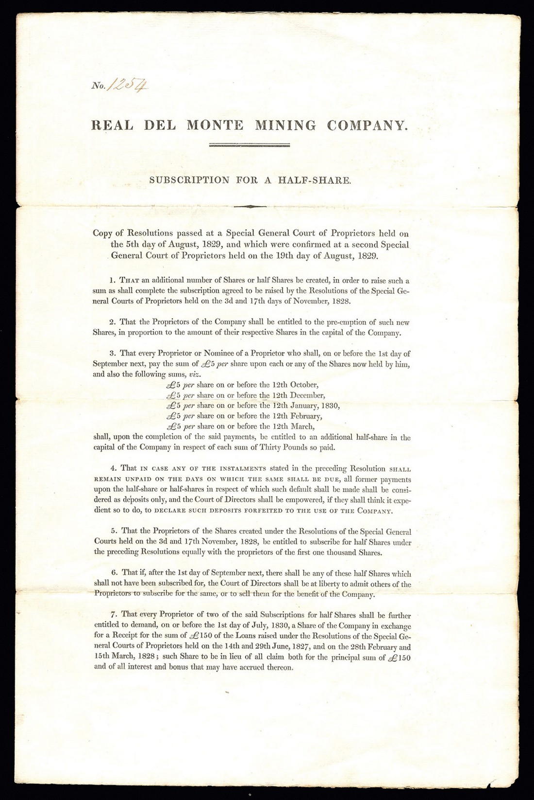 Real Del Monte Mining Company, certificate for subscription for a half-share, 1829, no.1254, 4 pages, all instalments paid, black, several embossed duty stamps, about VF and a scarce early piece.