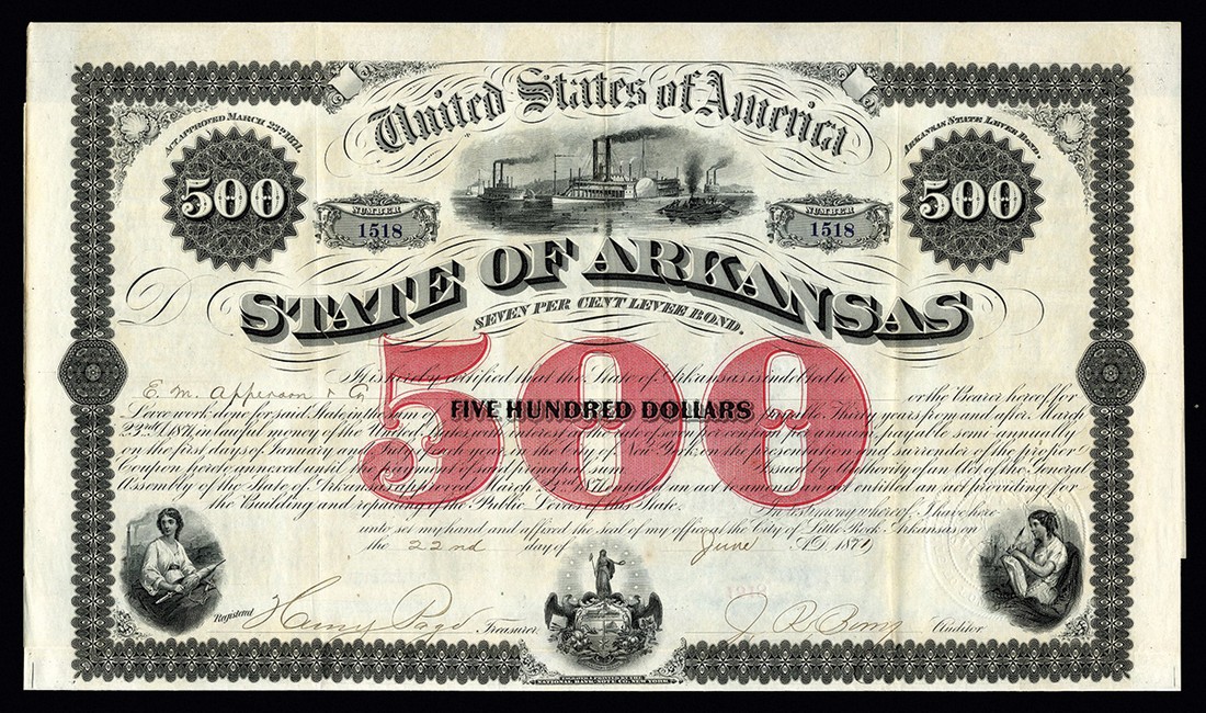State of Arkansas, 7% Loan, levee bond for $500, 187[1], no.1518, vignette of steam boats at top, allegorical figures at bottom, ornate border, black and red, with coupons, NOT cancelled VF.
