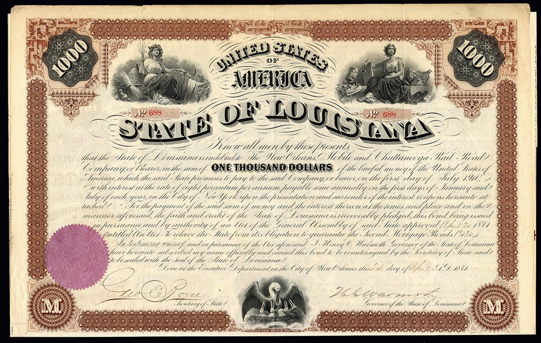 State of Louisiana, 8% Loan, bond for $1000, New Orleans 1871, no.688, allegorical females top left and right, pelican at bottom, ornate border, brown and black, with coupons (Criswell 71A) AVF.