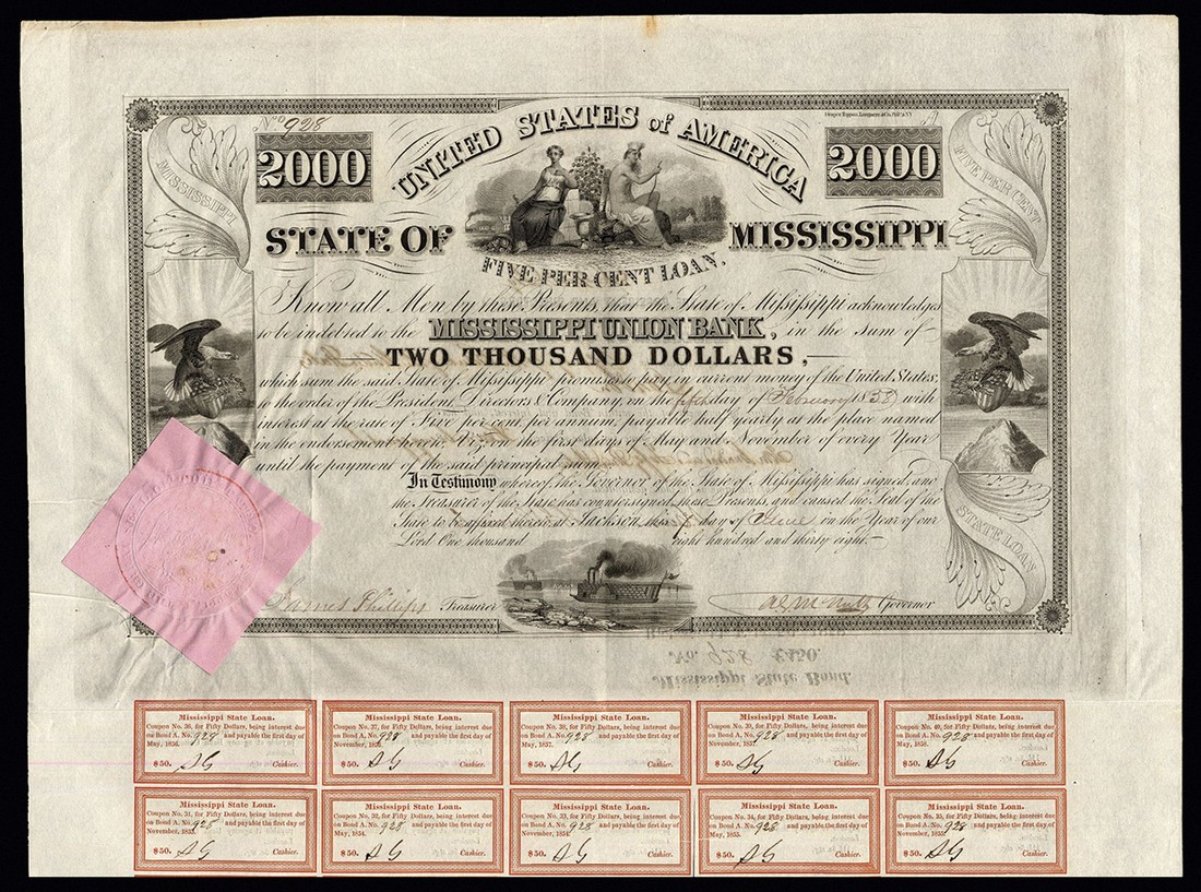 State of Mississippi, 'Mississippi Union Bank' 5% Loan, bond for $2000, 1838, no.928, allegorical females at top, American eagle to left and right, steam boat at bottom, black, pink seal, with coupons, AEF.