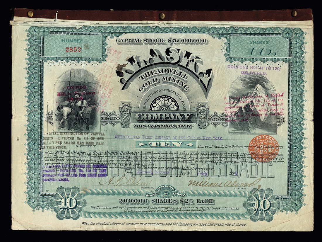 Alaska Treadwell Gold Mining Co., a pair of certificates for 10 shares and 20 shares of $25 each, both San Francisco 189[0], #2852 and 4427, vignettes of miners at work to left and snow capped mountains to right, green and orange respectively, both with coupons, some pinholes at top corners, F-VF. (2)