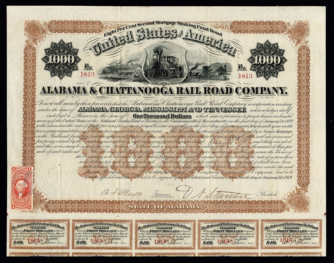 Alabama & Chattanooga Railroad Company (AL), 8% second mortgage sinking fund bond for $1000, 1869, no.1813, trio of vignettes at top of steam trains and industrial buildings, ornate border, brown and black, printed by the American Bank Note Co., with coupons, NOT cancelled, VF.