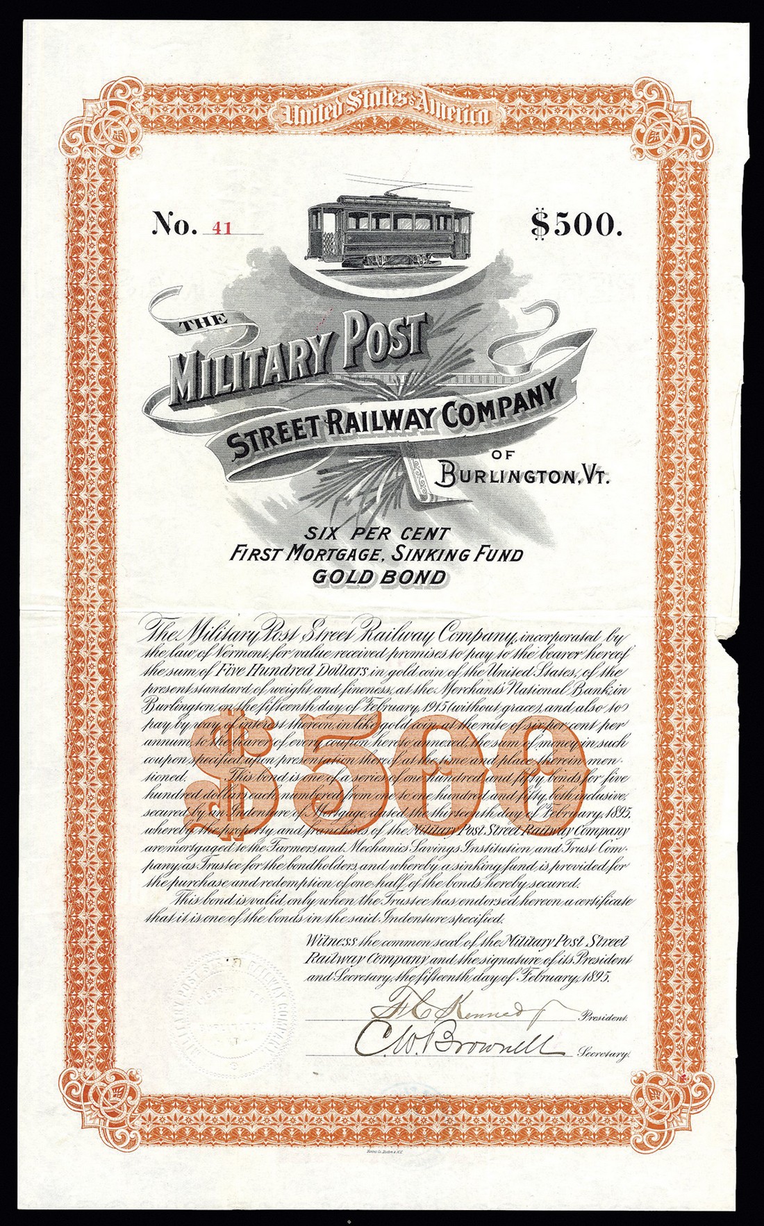 Military Post Street Railway Company of Burlington (VT), 6% first mortgage sinking fund gold bond for $500, 1895, no.41, of only 150 issued, electric tram car at top, ornate border, brown and black, nick in right edge where coupons poorly removed, VF and scarce.
