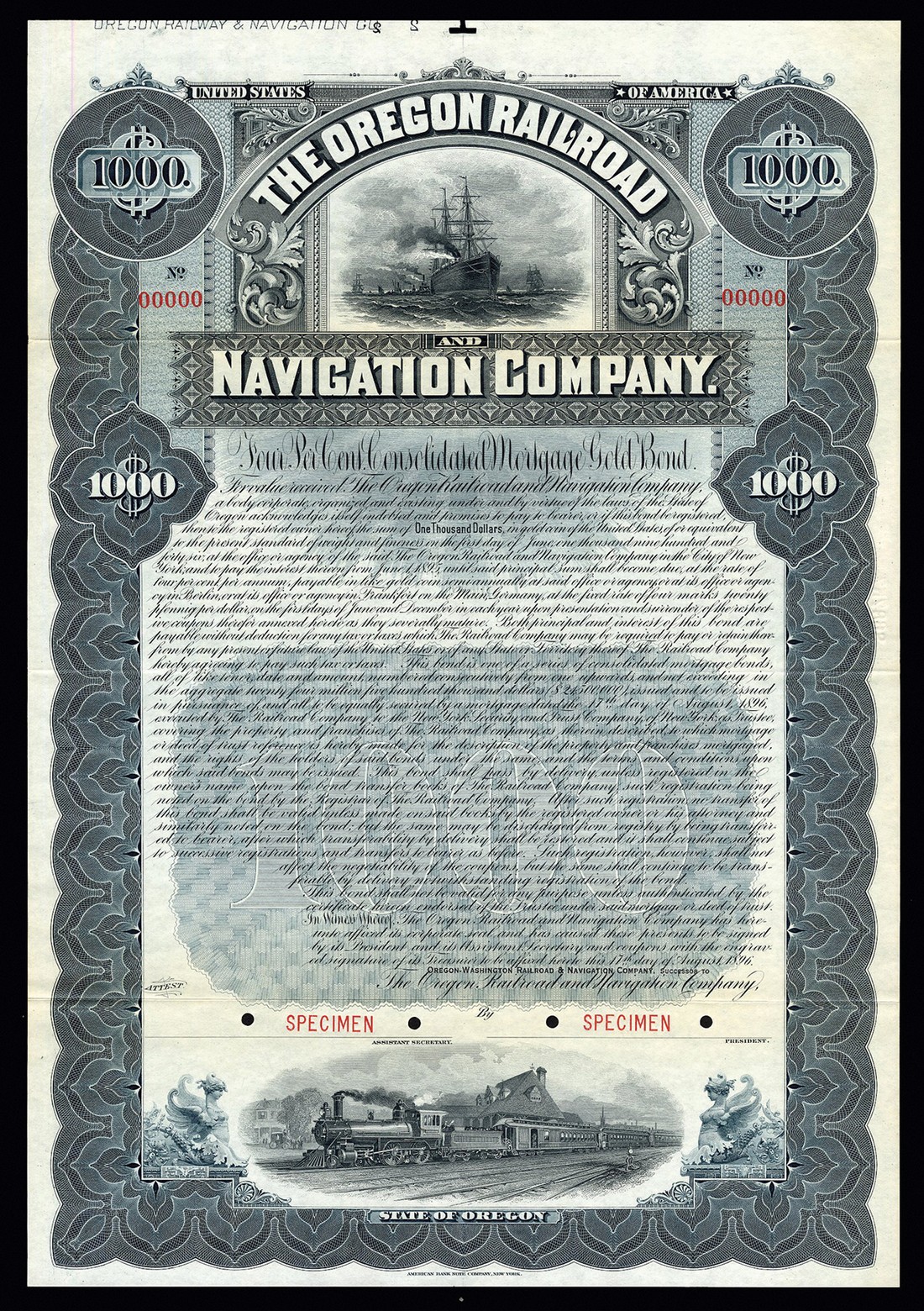 Oregon Railroad and Navigation Company (OR), 4% consolidated mortgage gold bond, $1000, a specimen certificate from the American Bank Note Co. archives, lovely vignette of steam ship bordered by scrollwork at top, steam train passing station at bottom, ornate border, blue-grey and black, GVF.
