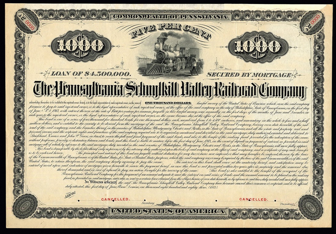 Pennsylvania Schuylkill Valley Railroad Co. (PA), an un-issued or probably specimen 5% mortgage bond for $1000, 1883, steam train at top, ornate border, black on buff paper, printed by the American Bank Note Co., numbered 0000 in red and cancelled in signature area, repair to top right edge, otherwise VF.
