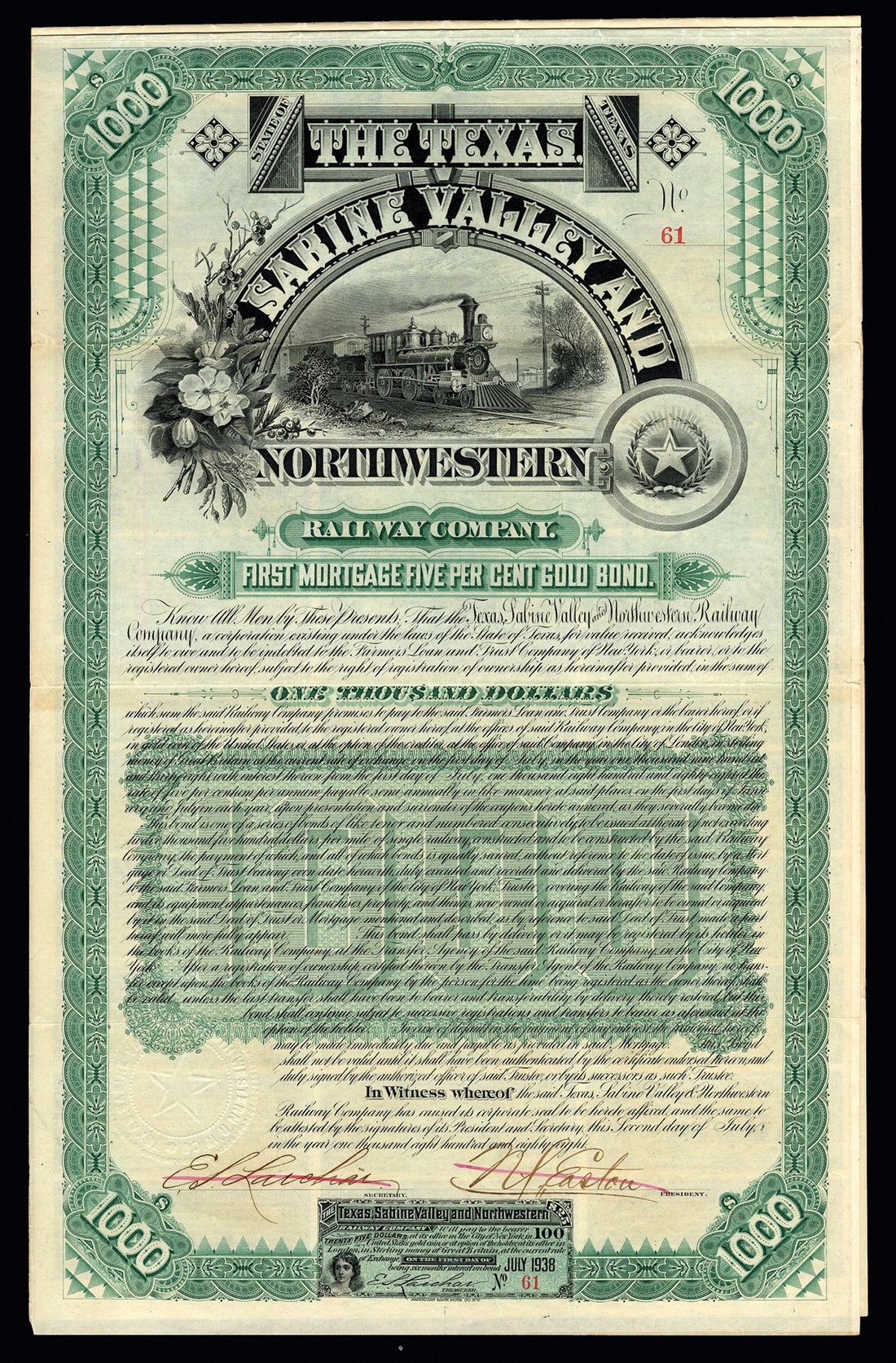 Texas, Sabine Valley and North Western Railway Co. (TX), first mortgage 5% gold bond for $1000, 1888, #61, vignette of steam train within title, ornate border, green and black, with coupons, cancelled with strike through over signatures, VF.