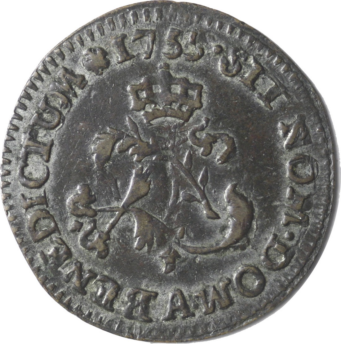 French Colonies. Billon Sou Marque, 1755 A. Paris. Dark. Very Fine. First Coinvestors certificate included.