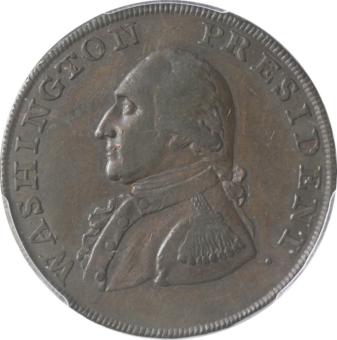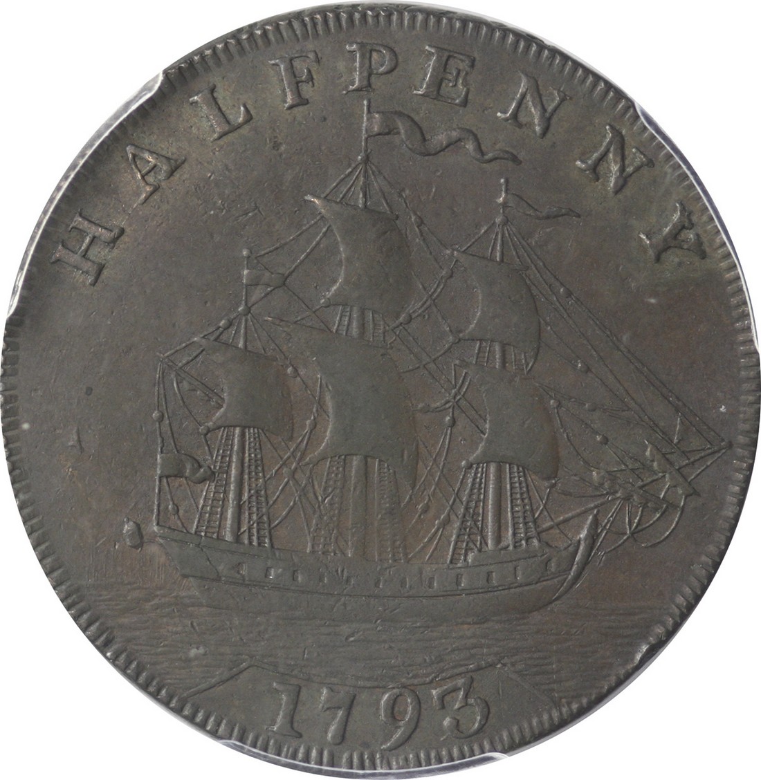 1793 Washington Ship Halfpenny. Breen-1225. PCGS XF45 and well struck for the issue. Defect-free and wholly natural, the surfaces are nicely adorned by shades of medium brown patina. Scarce and quite appealing. Ex Murray, Swope, Young, and Van Ormer Sale (September 1985). Bowers and Merena: 1838.