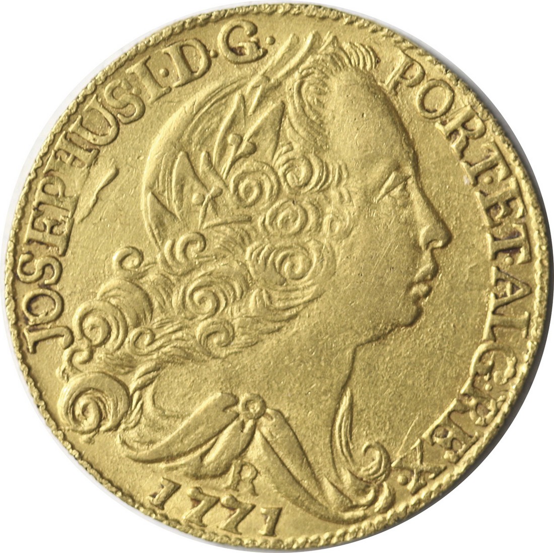Brazil/West Indies. 6,400 Reis, 1771 R. West Indies lightweight imitation. 10.91 gms. Laureate and draped José I bust r., rev. Crowned Arms. The devices close to the rims as the model for the dies was likely a clipped coin. Cf.Fr.65, KM 172.2. In the latter half of the 18th Century, the Brazilian 6,400 Reis, known as a Peca, Joe or Half Joe, was the most widely used gold coin for commercial transactions in North America and the Caribbean. Its importance in trade not surprisingly led to these lightweight contemporary imitations. Extremely Fine.