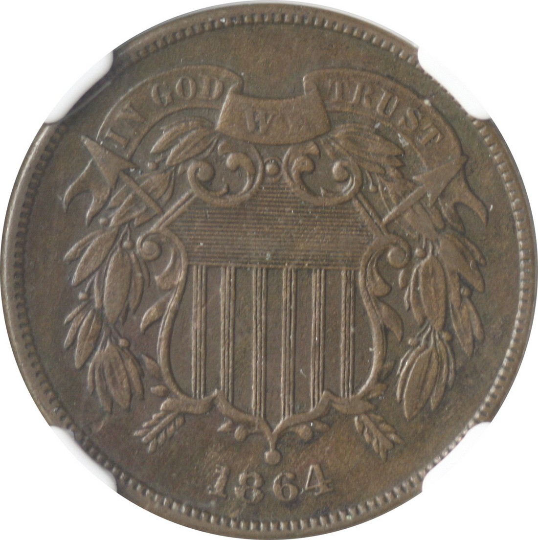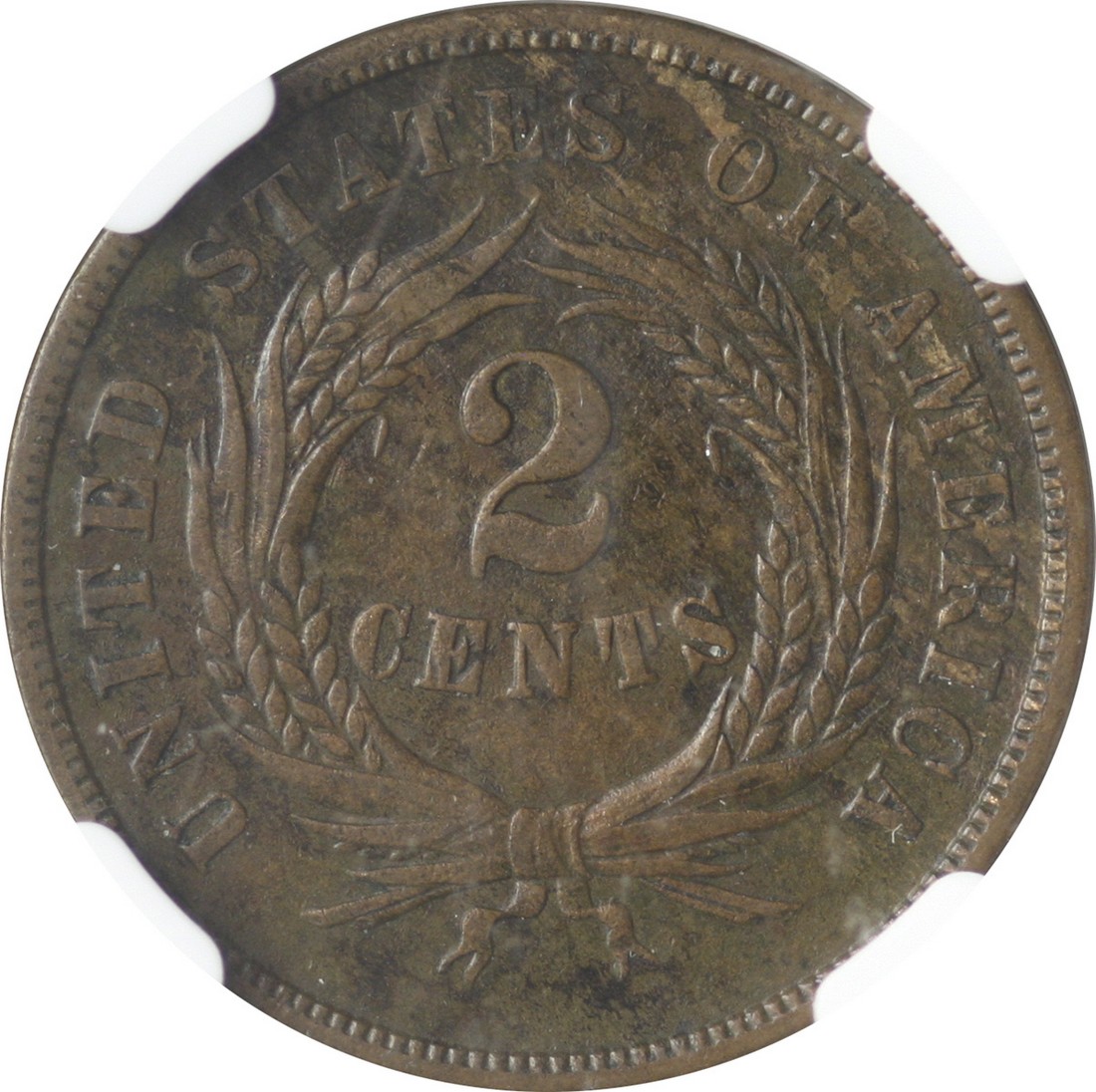 1864/1864 Large Motto Two Cent Piece. VP-004. The 18 of the date dramatically repunched. NGC AU Details, environmental damage. Examination of this olive-brown coin under a glass reveals a degree of surface roughness from poor storage.