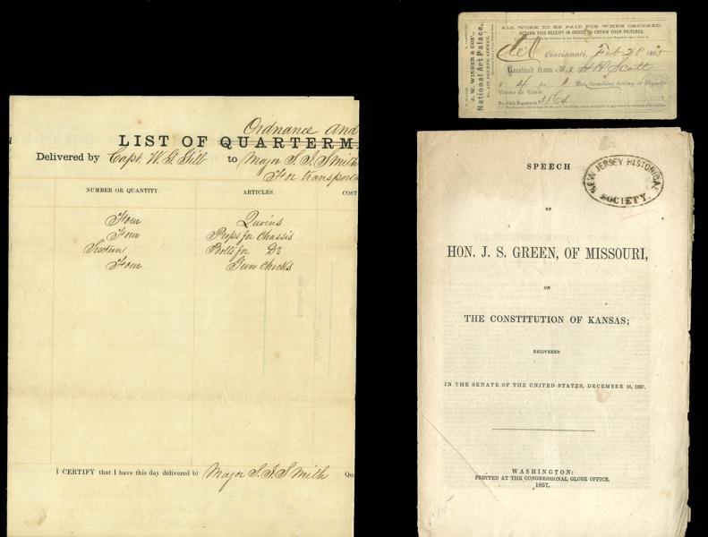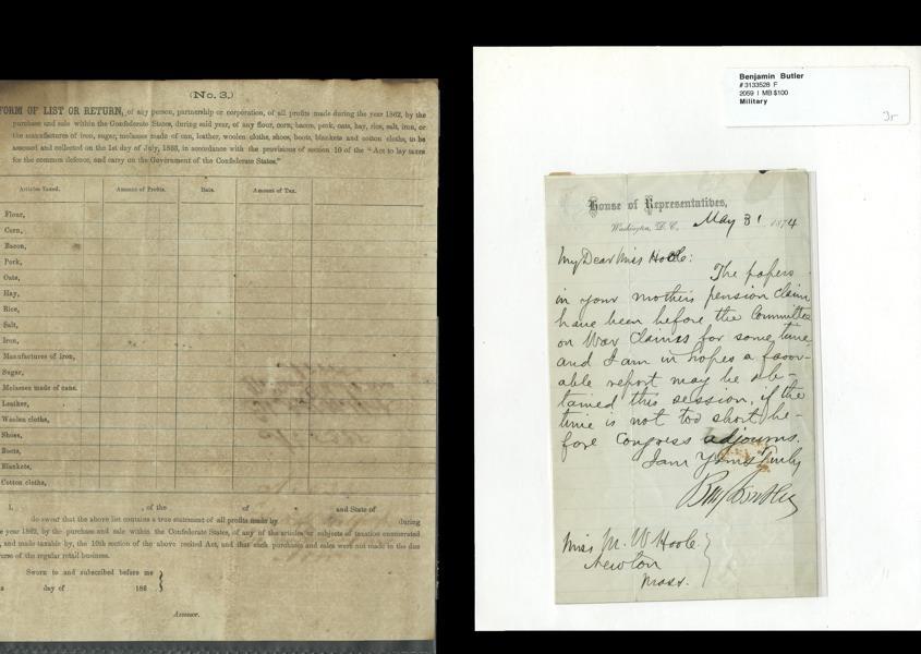 Civil War: Lot of documents, letters and sundry: * ALS by Benjamin Butler, as Rep-MA. One page, House of Representatives letterhead, small format, Washington, D.C. May 31, 1874. Butler a Union major-general during the war was much despised in the south during the Union occupation of New Orleans; he later became governor of the Bay State. Butler writes Miss Hoole regarding the war pension claims of her mother. Light adhesion on back; * Special Order No. 178, Union Army. One page, Hilton Head, Port Royal, S.C., April 1, 1863. Thomas Archer, NY Vol. Eng. Corps. is detailed on Special duty by Maj. Gen. Hunter. A true copy signed by Henry M. Dalrimple, 1st Lt. and Adjutant. After the Union seized Hilton Head in 1861 with one of the largest fleets ever assembled in North America, it became an important base of operations in its blockade of southern ports; * Letter giving a favorable assessment of the character of Pvt. Thomas Archer. One page, folio, Office of the U.S. Tax Commission, Beaufort, SC, Feb. 29, 1864; * Descriptive Roll of Animals belonging to Capt. James F. Hart's Company Horse Artillery, CSA, South Carolina. Folio, pale gray watermarked paper; * Letter to CSA Secretary of War James A. Seddon (misspelled by the author as "Seaden"). Two full pages, Richmond Dec. 28, 1863. The writer complains in detail that Major Gen. Ransom has disbanded a regiment that the author has raised. The letter continues but the additional page(s) is missing. A few small rents along the centerfold; * CSA tax form (No. 3) on profits made on staple goods during the year 1862 - flour, corn, bacon etc. Has not been filled out. Age toning; * CSA Ordnance and Ordnance Stores list delivered at Oglethorpe Barracks for transport to Hyde Island (flour, props for chassis, gun chocks…). Vertically split in two; also Speech of Hon. J.S. Green of MO on the Constitution of Kansas, 1857 pamphlet and National Art Palace receipt for pictures, Cincinnati, Feb. 28, 1865. Very Good to Fine. [9]