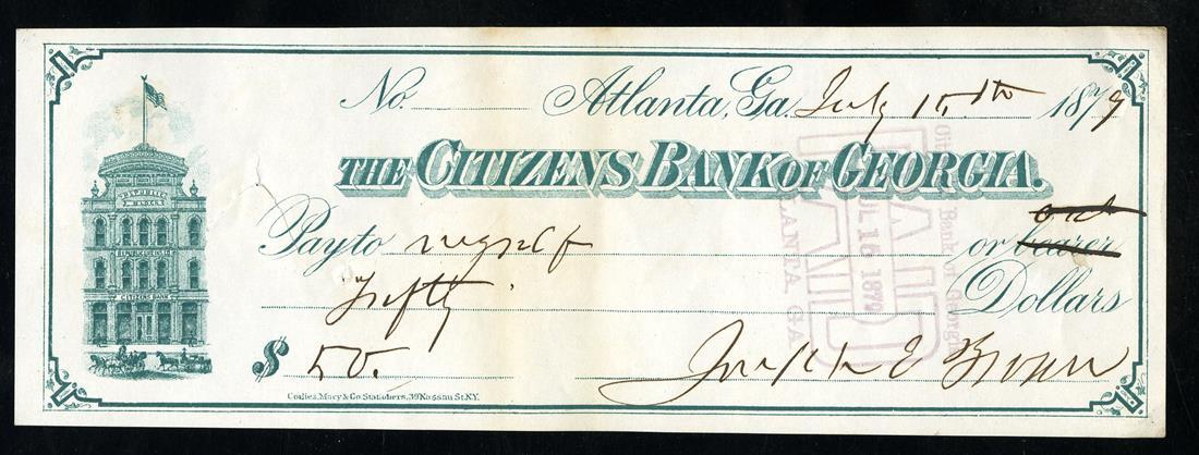 Post Civil War: Brown, Joseph Emerson. Governor of Georgia (1857-1865), leading secessionist and firm believer in states' rights, Chief Justice of the Supreme Court of Georgia after the war (1865-1870), president of the Western and Atlantic Railroad, elected to the Senate in 1880. Autograph Document Signed "Joseph E Brown". Check drawn on the Citizens Bank of Georgia, July 15, 1879 which Brown signs and pays to himself. Green, vignette of bank at left. Cut-canceled and purple Paid stamp. Good Very Fine.