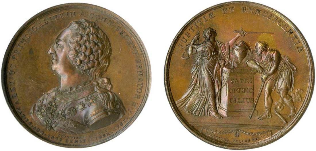 Russia. Catherine II, the Great (1762-1796). Death of Prince Alexei Gallitzen, 1767. Bronze. 47 mm. By J.C. Roettiers. Armored bust of the Prince left, wearing the Order of St. Andrew, rev. Justice and beggar - representing Generosity -- standing at opposite sides of an altar, inscribed: PATRI OPTIMO FILIUS, on which rests an urn; JUSTITIAE ET BENEFICENTIAE. Diakov 134.1. Good lustre. NGC Uncirculated Details Surface Hairlines.