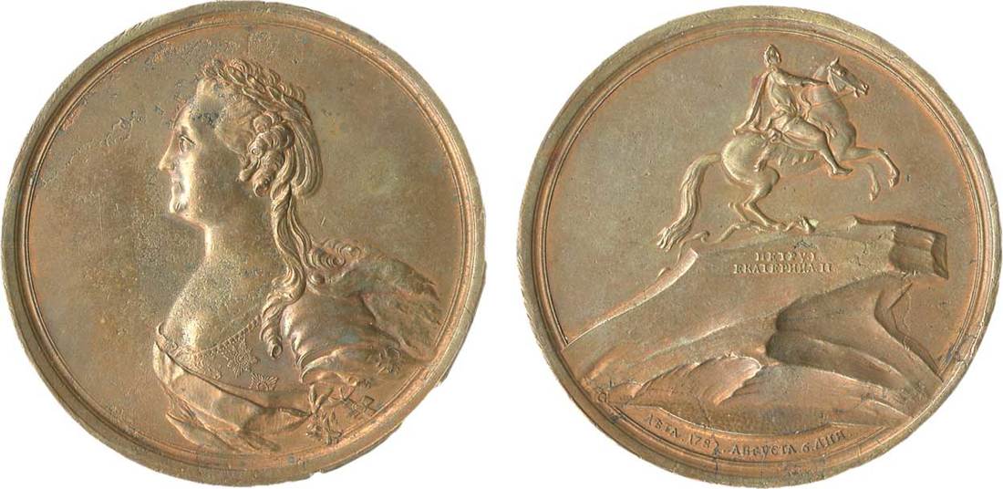 Russia. Catherine II, the Great (1762-1796). Unveiling of the Equestrian Statue of Peter the Great in St. Petersburg, 1782. Bronze. 55 mm. By Gass. Laureate, draped bust of the empress left wearing Orders, rev. View of the statue, rock it sits upon inscribed ?ETPY.I EKATEP?HA.II., signed "G" lower left. Diakov 194. Designed by French sculptor Étienne Maurice Falconet, the statue is set upon Thunder Rock, which is said to be the largest single rock ever moved by man. Some patches of metal impurity of porosity obverse and some reverse hairlines. Extremely Fine-AU.