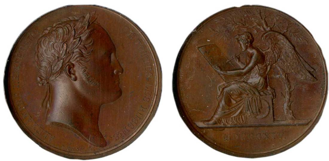 Russia. Alexander I (1801-1825). Visit of Emperor Alexander I to Paris, 1814. Bronze. 41 mm. By Andrieu. Laureate head of Alexander right, rev. Genius seated left before a tree inscribing notice of the visit upon a tablet. Diakov 378.1, Bramsen 1464, Julius 3015. Pleasing lustre, deep cherry-red brown. NGC MS 63 BN.