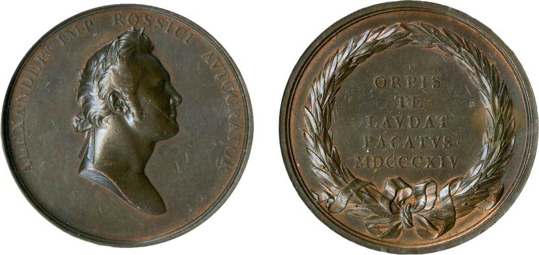 Russia. Alexander I (1801-1825). Visit of Emperor Alexander I to London, 1814. Bronze. 53 mm. By T. Webb, published by Sir Edward Thomason. Laureate bust right, rev. ORBIS TE LAVDAT PACATVS MDCCCXIV in five lines within wreath. Diakov 384.1, BHM 848, Eimer 1052. NGC MS 61.