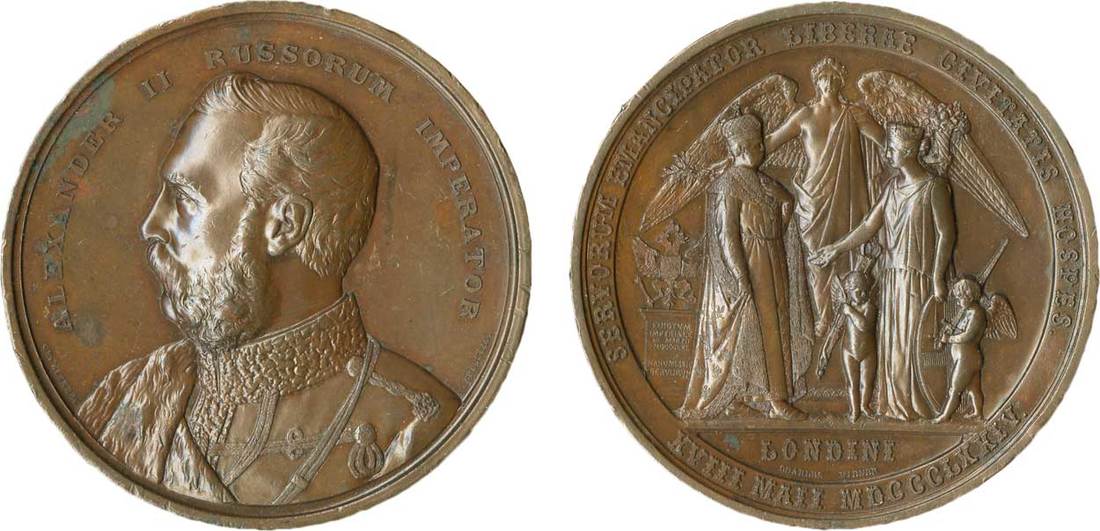 Russia. Alexander II (1855-1881). Visit of Emperor Alexander II to London, 1874. Bronze. 77.3 mm. By C. Wiener, for the Corporation of the City of London. Uniformed and draped bust of the emperor left, rev. Londonia standing left, two putti at her sides, welcoming Alexander II, attired in regalia, Peace standing behind them, Russian Imperial eagle on dais at left. Diakov 807.1, BHM 2981, Eimer 1634. Glossy dark café au lait over minor deposits at edge. Uncirculated.