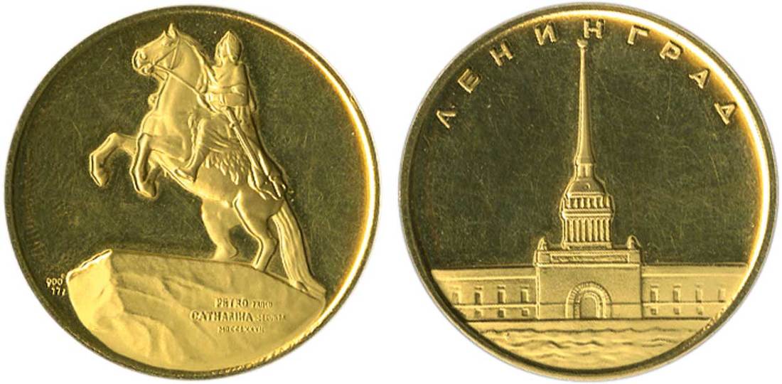 U.S.S.R. Equestrian Statue of Peter the Great. Medal, ca. 1978-1982. Gold, 16.88 gms. 29mm. View of St. Petersburg's Peter the Great statue with Catherine the Great 1782 inscription on its base, stamped "900 - 172" at lower left, rev. View of Saints Peter and Paul Cathedral, ?EH?H?PA? above. Light friction hairlines on prooflike surfaces. Brilliant Uncirculated.