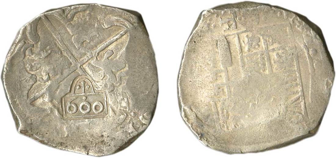 Brazil. Afonso VI (1656-1667). Countermarked Coinage. 600 Reis (1663). 26.94 gms. Type III. Crowned "600" in cartouche counterstamped on the reverse of a Spanish Colonial 8 Reales Cob (P-R?). Crown flanked by two pellets, domed arc, pellet above middle "0" of value. KM 19.1, Gomes 47.01. Host Good Fine, c/m sharp Very Fine.