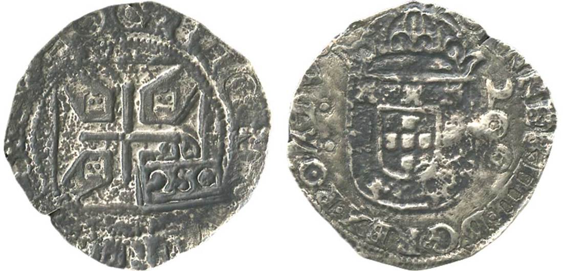 Brazil. Afonso VI (1656-1667). Countermarked Coinage. 250 Reis (1663). 6.15 gms. Crowned 250 in rectangular punch c/m on the reverse of a João IV Evora mint 200 Reis (KM 51), the "E's" all facing right. Gomes 42.13, KM 33.1. Salved, now toned. Very Fine.