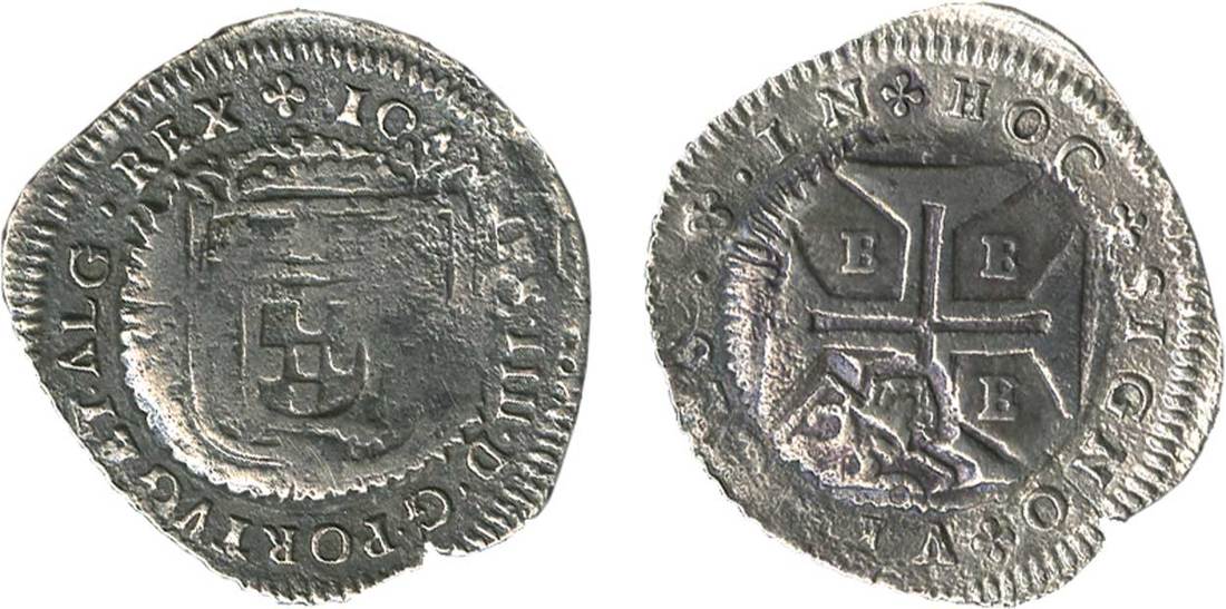 Brazil. Pedro II (1683-1706). 250 Reis (1688). 10.04 gms. Act of June 14, 1688 circular overstrike of both the obverse and reverse legends of a Type IV (1663) crowned 250 Reis c/m of Afonso VI on an undated Evora mint 200 Reis of João IV. Cf. KM 51 for host type and KM 435.2 (Portugal) for c/m. Very rare c/m and host combination. Host and c/m About Very Fine, overstrike Good Very Fine.