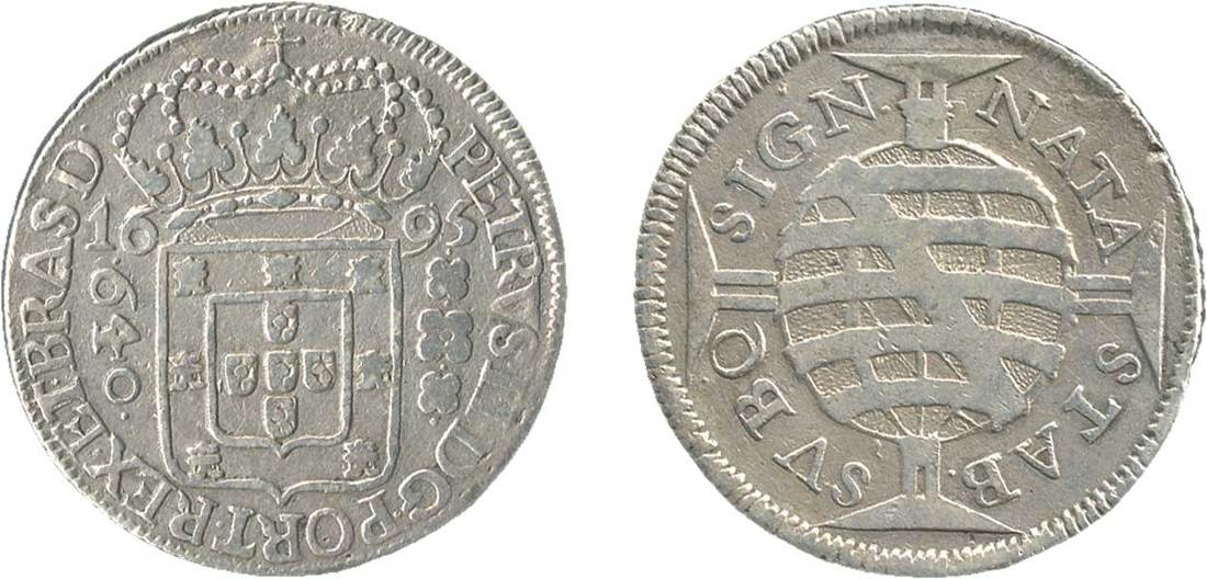 Brazil. Pedro II (1683-1706). 640 Reis, 1695. 18.58 gms. Crowned Arms, date across, numeral value left, Armillary globe of Jerusalem Cross. KM 83.1. About Very Fine.