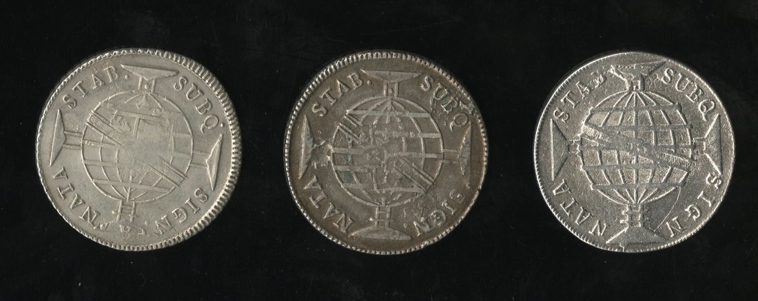 Brazil. João, as Prince Regent (1799-1818). Trio of 960 Reis: 1816 R (?) (2), and 1818 R. Rio de Janeiro. Crowned Arms, numeral value left, row of three cruciform rosettes at right, rev. Banded globe on Jerusalem Cross, mm at center. KM 307.3. Mintmark on the 1816s doesn't show through undertype's central design. The latter bright. Very Fine-Good Very Fine. (3)