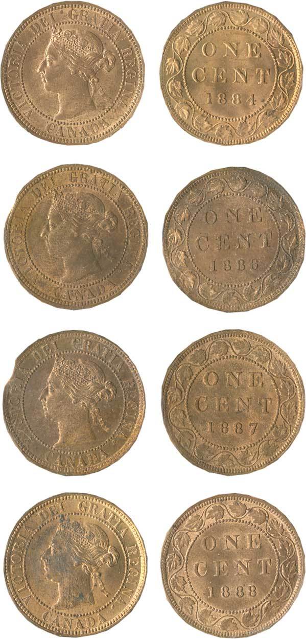 Canada. Victoria (1837-1901). Quartet of Uncirculated Canadian Large Cents. 1884, 1886, 1887 and 1888. KM 7. All Uncirculated. Red and brown. All retain abundant original mint luster; the 1884 and 1887 display some areas of darker toning. (4)