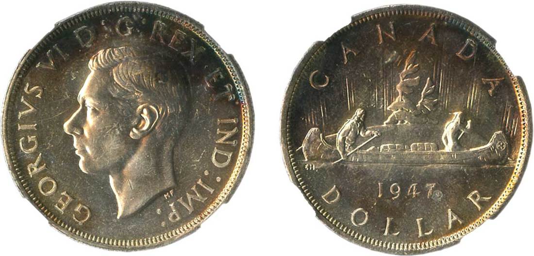 Canada. George VI (1936-1952). Dollar, 1947. Maple Leaf. KM 37. NGC MS 62. With exquisite rose, blue and golden brown tones accentuating the main design features.