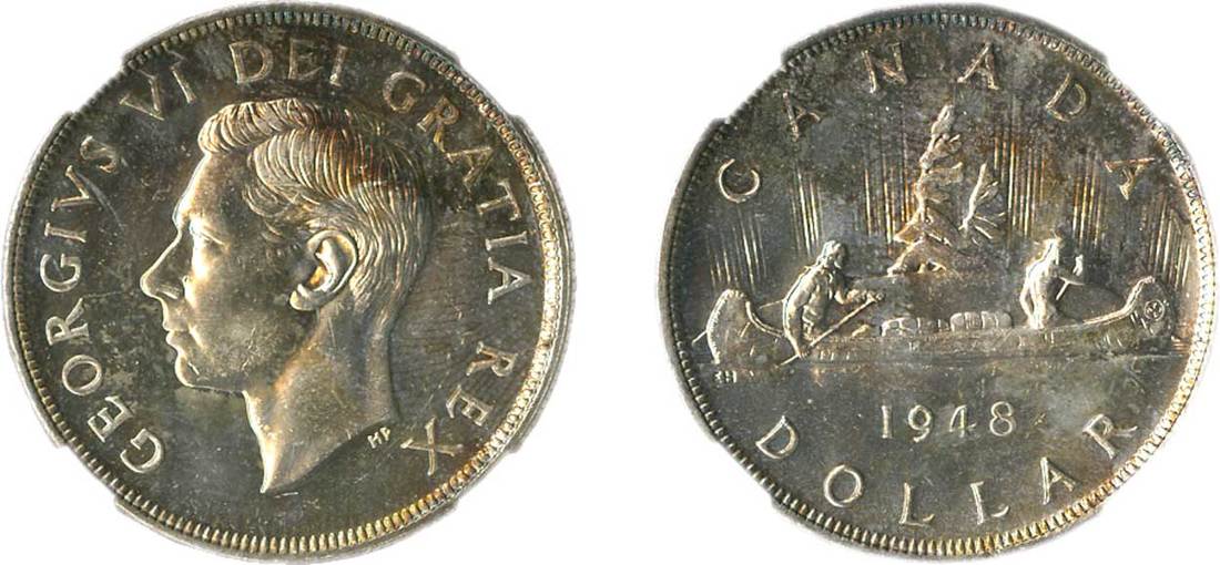 Canada. George VI (1936-1952). Dollar, 1948. KM 46. NGC MS63. Light and attractive tones of pink, blue and golden brown grace this beautiful example. Only 18,780 were minted, making this the key date in this attractive series.