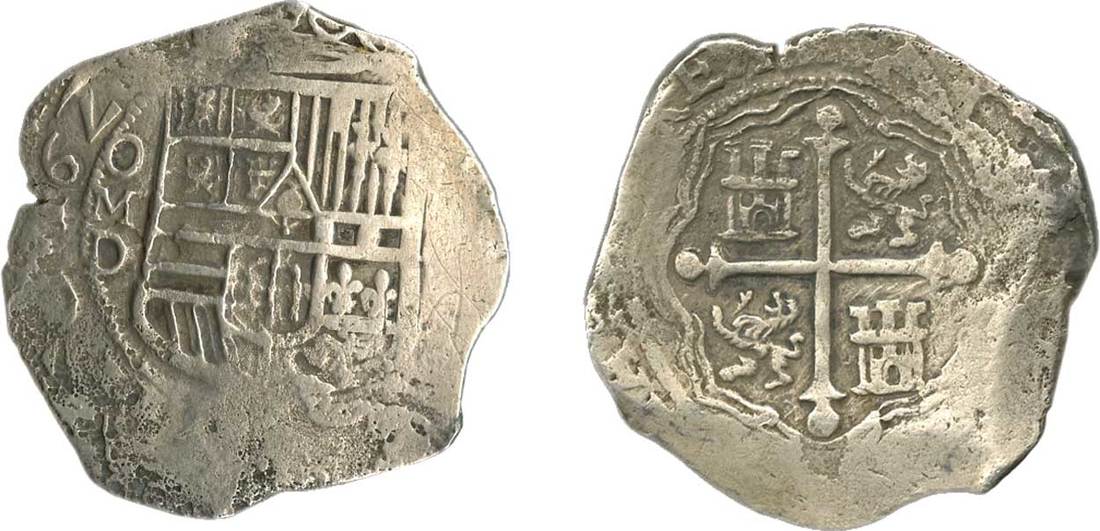 Mexico. Felipe III (1598-1621). Cob 8 Reales, 1621 Mo D. Mexico City. 24.37 gms. Crowned Arms, date in left margin, rev. Quartered Arms of Castile and Leon. KM 44.3. Some old scratches obverse right margin, some porosity and typical honeycombing in margins. Crude About Very Fine.
