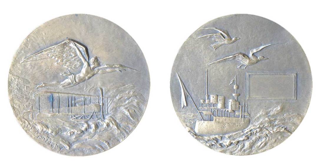 Aviation. France. Hydro-Aéroplane, nd (1913). Medal. Bronze. 67.5mm. By Françoise Montagny. Icarus flying above biplane flying boat, rev. Two seagulls flying above ship, tablet at right. CGMP p.264. Rare. Small dark spot on plane strut. Extremely Fine.