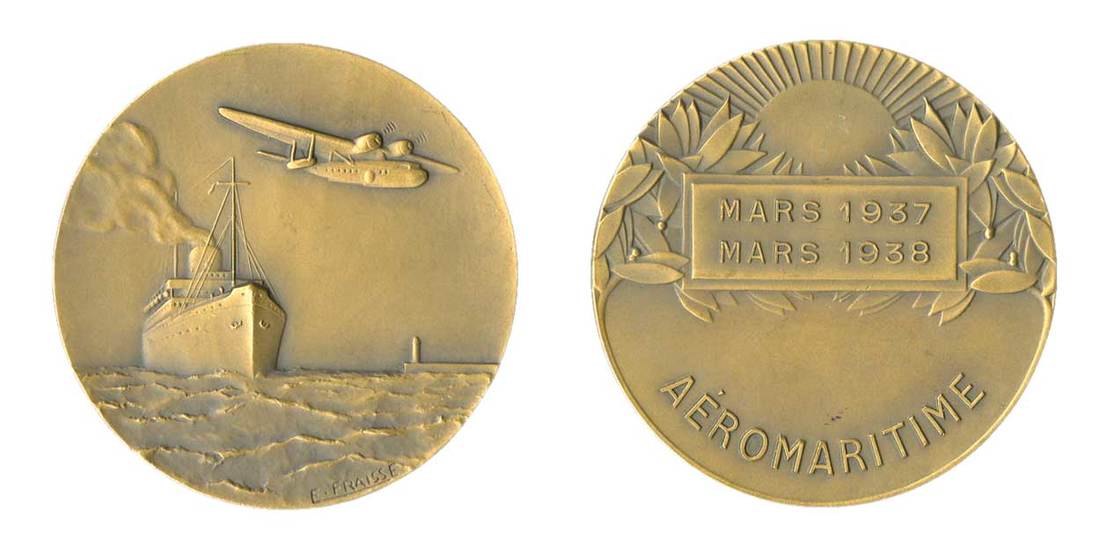 France. Aéromaritime, 1938. Bronze. 50 mm. By Fraisse. Sea-plane flying above passenger ship, seawall in distance, rev. MARS 1937 MARS 1938 on plaque framed by branches and radiant sun above; AÉROMARITIME below. Edge: BRONZE (triangle). Scarce. Uncirculated.